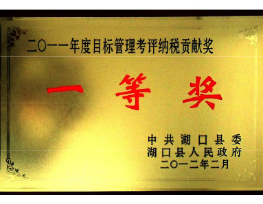 中共湖口縣委、湖口縣人民政府聯(lián)合授予“2011年度目標管理考評納稅貢獻獎一等獎”榮譽
