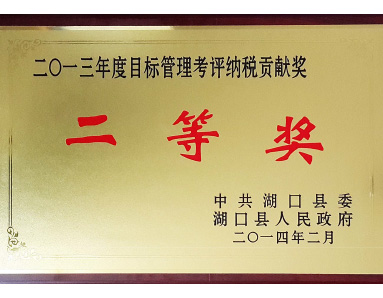 中共湖口縣委、湖口縣人民政府聯(lián)合授予“2013年度目標管理考評納稅貢獻獎二等獎”榮譽