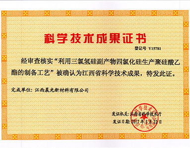 “利用三氯氫硅副產(chǎn)物四氯化硅生產(chǎn)聚硅酸乙酯的制備工藝”被江西省科學技術(shù)廳授予“江西省科學技術(shù)成果”榮譽