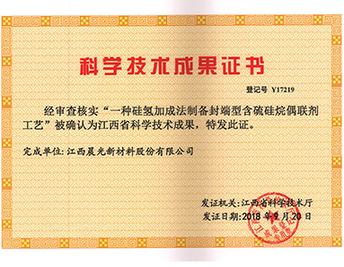 “一種硅氫加成法制備封端型含硫硅烷偶聯(lián)劑工藝”被江西省科學技術(shù)廳授予“江西省科學技術(shù)成果”榮譽